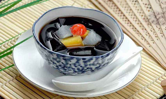 龟苓膏 龟苓膏所含的中药成分是龟板和土茯苓,由于具有清热、解毒、祛湿的保健功效,再加上入口滑滑润润,很受欢迎。不过,龟板属寒性,脾胃虚弱者、痛经的女性应少吃,孕妇慎用。另外,吃完龟苓膏别马上喝茶。