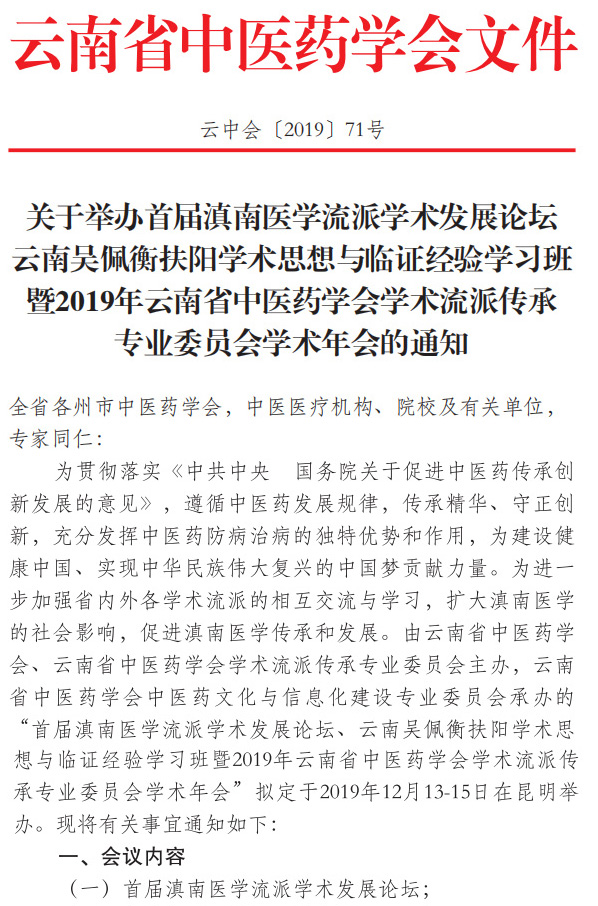 关于举办首届滇南医学流派学术发展论坛云南吴佩衡扶阳学术思想与临证经验学习班的通知