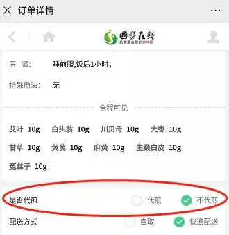 是否代煎,请在订单详情页面进行勾选。系统会根据医生开具的付数和服用天数,自动识别所代煎制作的袋数和费用。