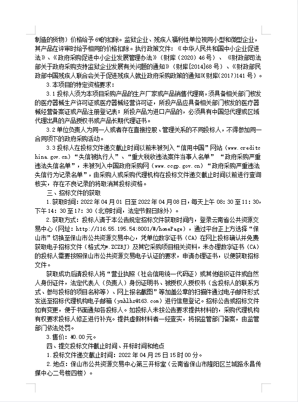 保山市中医医院眼耳鼻喉科医疗设备采购项目公开招标公告