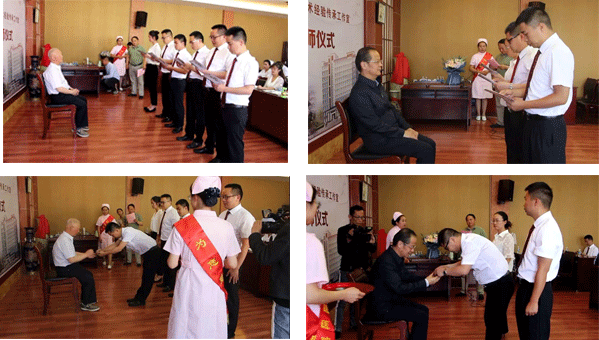 拜师仪式上,保山市中医医院内科杨勇、黄绪兵、宋旭丽,针推科陈琰东、革康成、郭兴滔、谭方、谭文杰、袁媛与保山中医药高等专科学校杨淳共10名优秀骨干医师恭敬地按照传统拜师礼仪向两位教授诵读、献上拜师帖,敬茶,送鲜花,行叩首礼。同时,两位教授为徒弟赠送了礼物,颁发了拜师证书,并叮嘱徒弟要立“大医精诚”之志,拥有仁心、仁术治病救人,并要多学经典,多做临床、多总结。