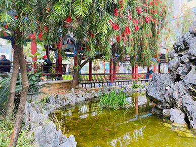 院内的花园里榕树、海枣树、蒲葵树、杨梅树、杏子树、桂花树、玉兰花、山茶花等各类树木高低错落,相互交织,郁郁葱葱,大家都说这里就像一个小型的森林氧吧,置身花园里,空气中弥漫着淡淡的花香和泥土的芬芳,穿梭在花园的各类鸟儿不时发出清脆的鸣叫声,总能让身心得到放松,与院外的车水马龙相比,这里亦显得宁静祥和,患者和家属喜欢在这里闲聊、小憩,就连周边的居民也会来这里“转转”“闲闲”,听一听鸟鸣虫叫,逗一逗池里的鱼儿。说起鱼池,不得不提一下池里的鱼儿,它们大多数是医院爱好钓鱼的职工投放的,有的鱼儿也许已年岁不小了。