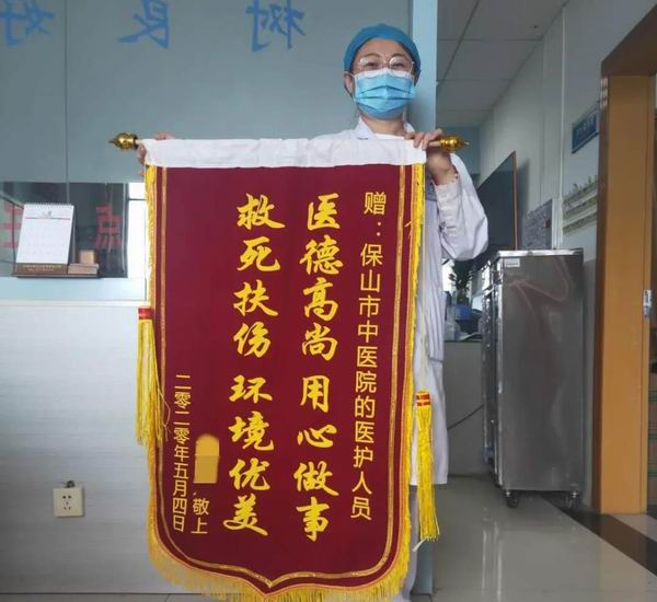 我院内一科以诊治神经、消化内科及风湿免疫性疾病、肾病为主,一年四季都是非常忙碌的科室,患者常常处于满员的状态,虽然每天的工作都在紧张、忙碌中度过,但是以高度的责任感和细心热情的态度对待每一位患者一直是科室所有医护人员的工作理念。这不,5月,内一科也收到了两面锦旗,一面锦旗写着“医德高尚,用心做事,救死扶伤,环境优美”赠予保山市中医医院医护人员,患者王先生用简单的语言表达了其住院期间的真实感受。