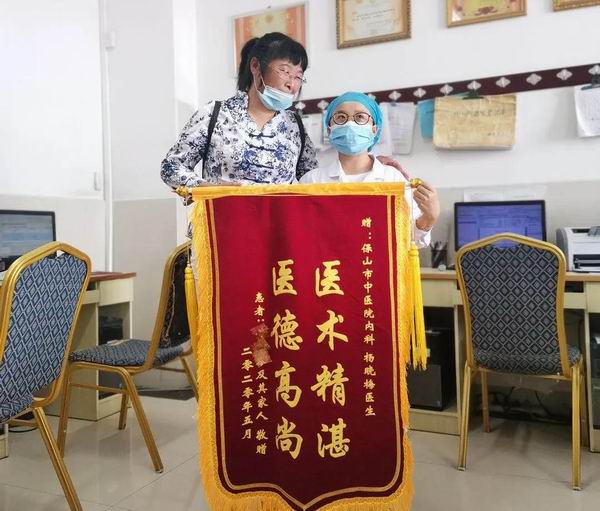 另一面锦旗写着“医德高尚,医术精湛”赠予内一科杨晓梅医生,故事要从4年前说起:4年前,50余岁的患者黄女士,长期乏力、心慌、出汗、失眠,辗转多家医院就诊未见改善,后到我院就诊时,杨晓梅医生经过认真的检查,进一步明确了诊断,经过治疗,黄女士的症状逐渐好转直至消失,近年来也一直定期到内一科复查。5月中旬黄女士与女儿带着锦旗送到了杨医生的手中。