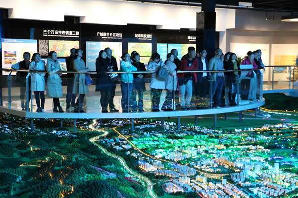 到达展览馆后,全体党员在讲解员的带领下,沿着过去、现在、未来的时间线索逐一参观了序厅、哀牢古国话往昔、城市发展绘蓝图、新城规划奏新章、产城融合谋发展、总规沙盘、阳光规划等7个展区,并且观看了《中国·保山》、《保山工贸园区》、《“三个万亩”生态廊道恢复工程》三个城市规划宣传片。当来到展馆中心的城市总体规划沙盘展区,站在沙盘上,脚下的“保山城”在五彩斑斓的灯光照射下给大家带来了视觉的震撼,大家不由得惊叹“保山的未来潜力无限呀!”