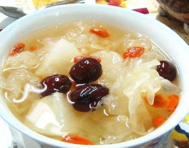 材料:鲜银耳半朵,雪梨半个,鲜百合100克,红枣(去核)5个,冰糖适量。