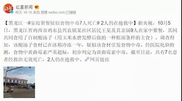 今年国庆假期期间,黑龙江省鸡西市一家9口在家聚餐后出现食物中毒,送医治疗后,9人中有7人经救治无效死亡,还有2人仍在抢救。
