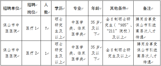 根据《中共保山市纪律检查委员会中共保山市委组织部保山市人力资源和社会保障局保山市监察局关于进一步规范事业单位公开招聘行为加强招聘工作监督的通知》(保人社联〔2014〕14号)、《中共保山市委组织部保山市人力资源和社会保障局保山市公安局转发<中共云南省委组织部云南省人力资源和社会保障厅云南省公安厅关于印发云南省事业单位公开招聘工作人员办法>的通知》(保人社联〔2016〕24号)、保山市人力资源和社会保障局等5部门《关于印发〈保山市医疗卫生系统引进紧缺高层次人才实施方案(2018—2020年)〉的通知》(保人社联〔2018〕15号)和《云南省卫生计生委办公室关于赴省外部分医学高等院校开展人才招聘活动的通知》等文件精神,经保山市人民政府批准,现将保山市中医医院2018年到省外部分医学高等院校招聘人才事宜公告如下: