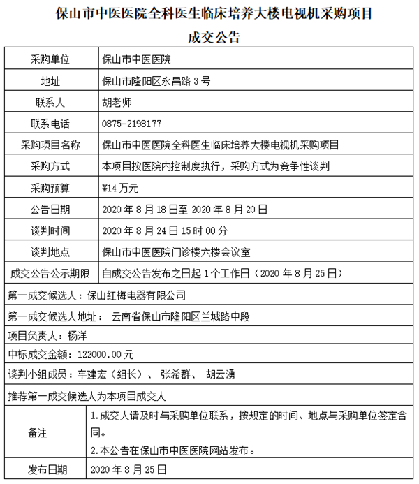 保山市中医医院全科医生临床培养大楼电视机采购项目成交公告