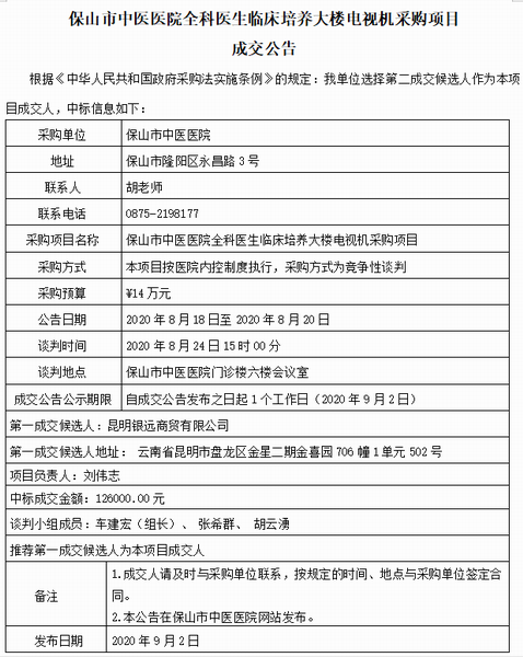 保山市中医医院全科医生临床培养大楼电视机采购项目成交公告