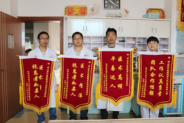 赵奶奶一共做了4面锦旗,分别送给骨伤科二病区全体医护人员、王恩斌主任、任定宝、杨仕成医师,非常不恰好的是这几位医师因上门诊及做手术都不在科室,科室杨仕德医师接过赵奶奶的锦旗,询问了赵奶奶的恢复情况,并对赵奶奶表示深深的感谢。