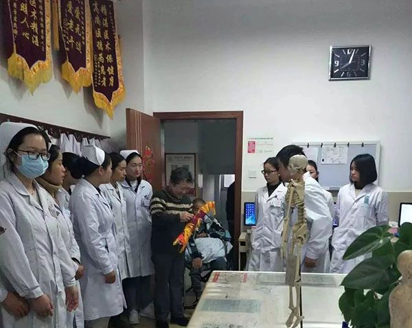 2019年1月28日上午08:10,针灸推拿科的医护人员像往常一样进行晨间交班会,突然,一位患者由家属推着轮椅进来,对全体医护人员说:“对不起,各位医生,我打断一下你们开会。我是36床患者朱**的姐姐,我弟弟自从转院过来后一天比一天好转,现在能吃、能说、能站,是你们给了他一次新生的机会。今天趁着大家都在,特地制作了一面锦旗送过来。感谢针灸推拿科的医生、护士精心医治、护理。谢谢大家了。”