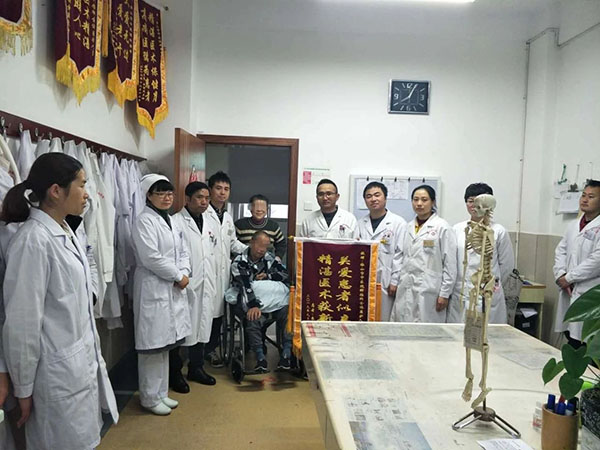 轮椅上的朱大哥连忙说:“谢谢医生、护士,谢谢大家”。然后激动地把一面印有“关爱患者似亲人,精湛医术获新生”的锦旗郑重地送到陈琰东主任手中。