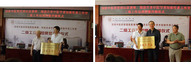 夏惠明、郑进两位教授分别向保山市中医医院授予国家中医药管理局名老中医学术经验传承工作室二级工作站牌匾。