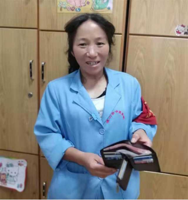 夏会菊作为一名普通的医院保洁员,工资收入并不高,家庭经济也不宽裕,两个小孩还在上学,可以说等着用钱的地方很多,但她在拾到钱包和手机的时候,没有丝毫的私心想要据为己有,脑子里想的只是失主丢了钱包、手机该有多着急呀!得赶紧想办法还给他们。