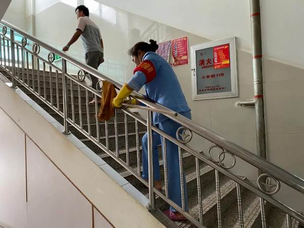 结合爱国卫生七个专项行动(“清垃圾、扫厕所、勤洗手、净餐馆、管集市、常消毒、众参与”),我院多措并举进一步加强室内外环境卫生整治。垃圾、污水、污物日产日清;日常保洁、消毒查杀全覆盖,每日两次,发热门诊、电梯、厕所、楼梯扶手等重点区域频次进一步加强。