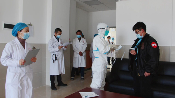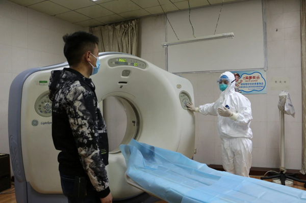 第二个场景设定为医院门口监测点发现一名未戴口罩,体温38.5℃,近来居住在省外中高风险地区的患者。演练内容包括发现发热病例、预检分诊接诊、发热门诊接诊、患者检验标本采集运转、CT检查、患者转移至隔离病区、疫情上报、院内会诊、患者转诊、环境消杀等环节。