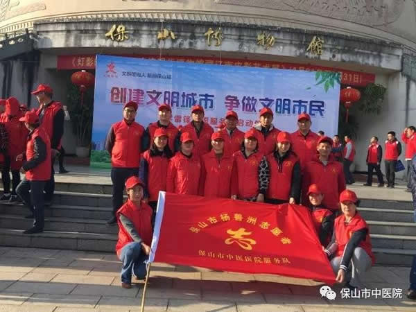 为充分动员广大干部群众发扬雷锋精神,积极投入到创建文明城市中来,以实际行动服务群众、服务社会,根据市、区文明办统一部署,2018年3月5日,保山市中医医院15名杨善洲志愿者服务队员在杨继渊副院长的带领下,积极参加保山市暨隆阳区“创建文明城市 争做文明市民”学雷锋志愿服务月启动仪式。